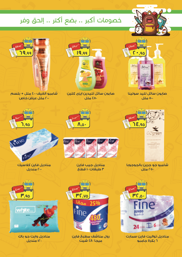 - عروض المنظفات : صابون سائل لليد (سولينا ، ايزى كلين)، شامبو، مناديل (تواليت، مطبخ، جيب، ومعطرات ومنظفات (برسيل، اكسترا، بريل، ديتول، جينيرال، فيبا)، (رول اكياس ثلاجة، رول تغليف، رول المونيوم).